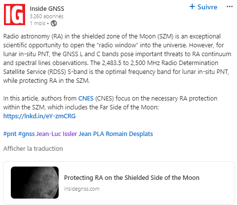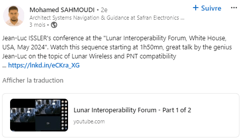 À partir de septembre 2021, je fus expatrié aux Emirats Arabes Unis, toujours en tant que CNES, dans le cadre d’une collaboration avec l’Agence Spatiale Emirienne en Radio Fréquences ! Une belle aventure technique et familiale ! Depuis mon retour des EAUs un an plus tard, j’assure au CNES une expertise, principalement en transmissions spatiales optique, en radionavigation par satellites, et en normalisation des transmissions spatiales. Ceci m’a notamment conduit à faire une présentation à la Maison Blanche dans le domaine des systèmes de type GPS et des transmissions sans fil lunaires (et desinterférences associées), et un article de synthèse quant à nos travaux sur la protection de la radio astronomie sur la face cachée de la Lune :